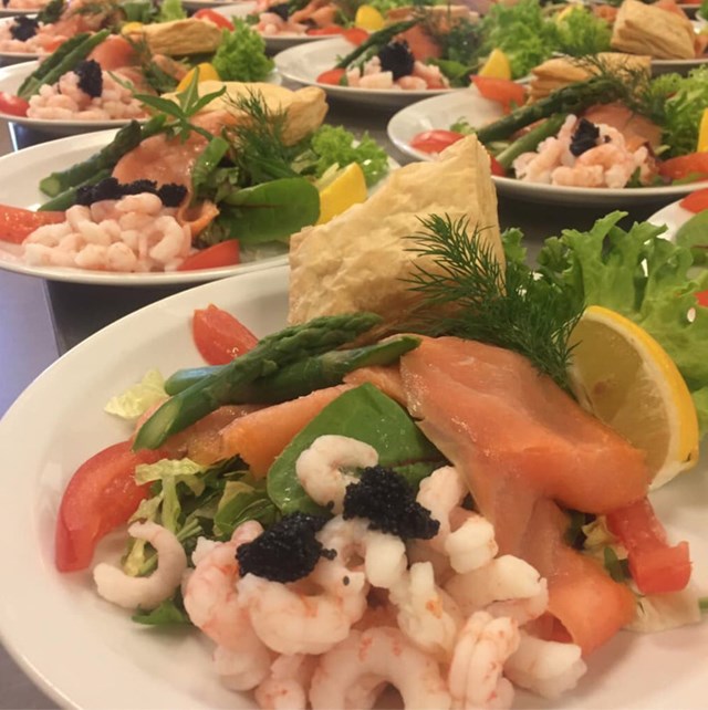 Foto: Privat // Stjerneskuddet med tigerrejer, kaviar og grønt, er blot en af de indbydende forretter, Kirke Stillinge forsamlingshus tilbyder til familiefesten