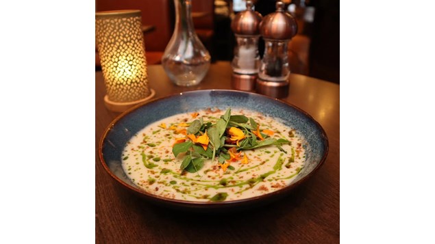 Det regner og kokken har lavet en lækker jordskokke suppe, med baconcrumble og purløgsolie til denne efterårsdag!