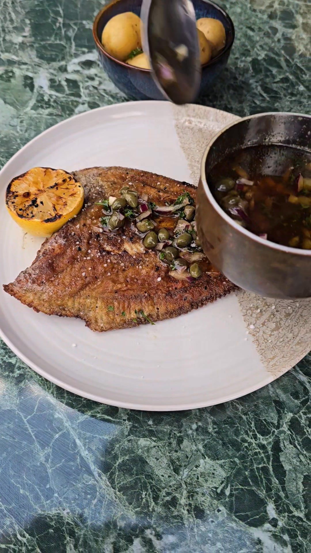 Helstegt rødspætte med nye kartofler og brunet smørsauce med kapers, rødløg og frisk persille
