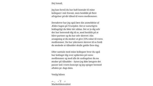 Men sagen er nok at fordi jeg (Ismail) (personligt) valgte at skrive en trustpilot anmeldelse (igår) den anden vej til ældresagen, så blev samarbejdet opsagt . Og ældresagen mener selvfølgelig ikke det derfor, men fordi vi har "mange" afvigelser" på vores menukort . Ting som allerede givet tilbud ..