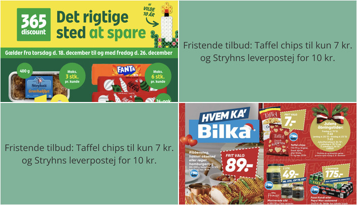 Bilka tilbyder et godt udvalg af Taffel chips, herunder snack hjul, hjerter eller sticks, til en skarp pris på kun 7 kr. pr. pose. Tilbuddet gælder fra fredag den 19. december til onsdag den 24. december.