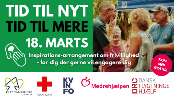 Mød lokale organisationerDu får mulighed for at møde repræsentanter fra flere lokale organisationer, herunder KFUM, Natteravnene, Headspace, Slagelse Kommune, Frivilligcenter Slagelse, DRC Dansk Flygtningehjælp, KVINFOs mentornetværk, Mødrehjælpen, Røde Kors, Barnets Blå Hus og Red Barnet. Disse organisationer står klar til at fortælle om deres arbejde og de frivilligmuligheder, de tilbyder.