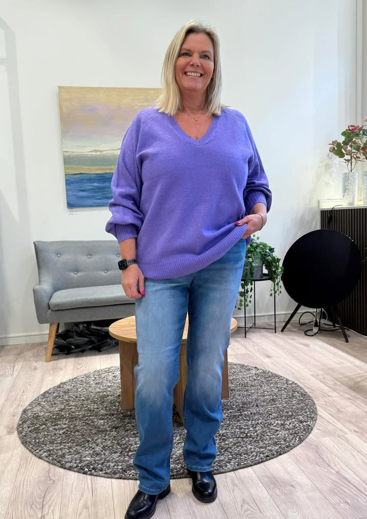 Skøn strik med V hals fra NO 1 BY OX i den flotte nye lilla, og selvfølgelig sort